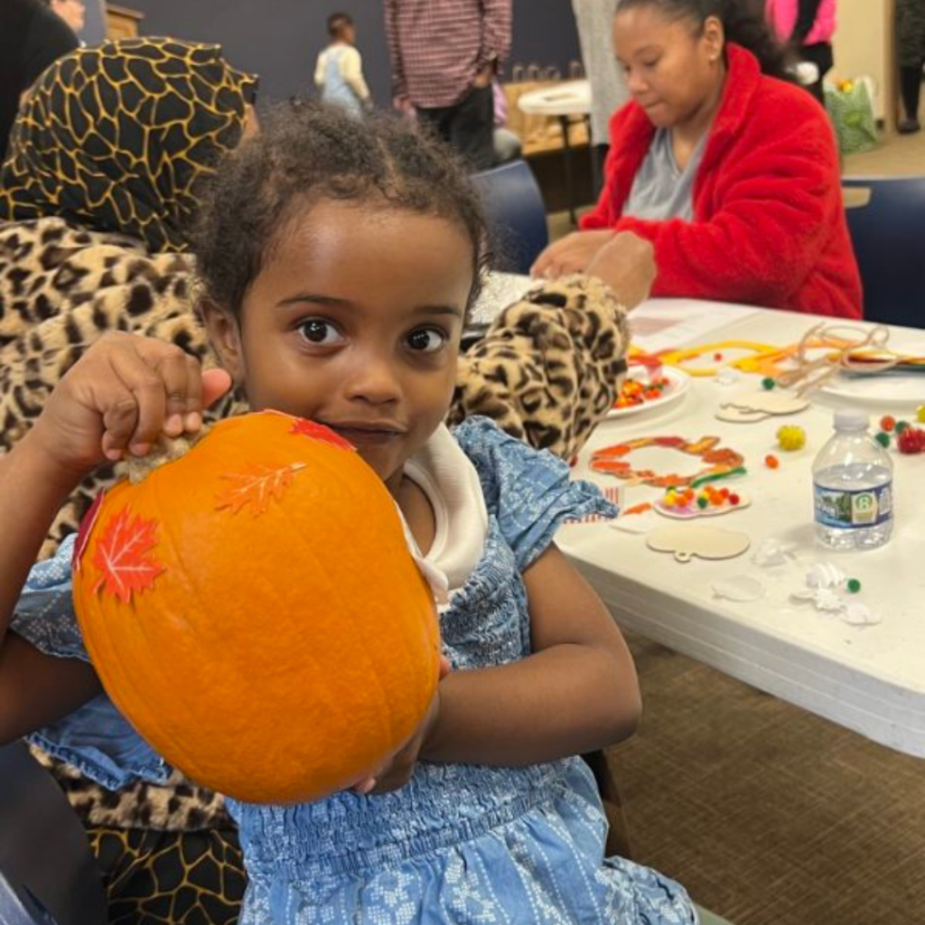 After the discussion, parents and children decorated pumpkins using tissue paper, pom poms, glue, and chenille stems. The activity supported multiple learning goals:
