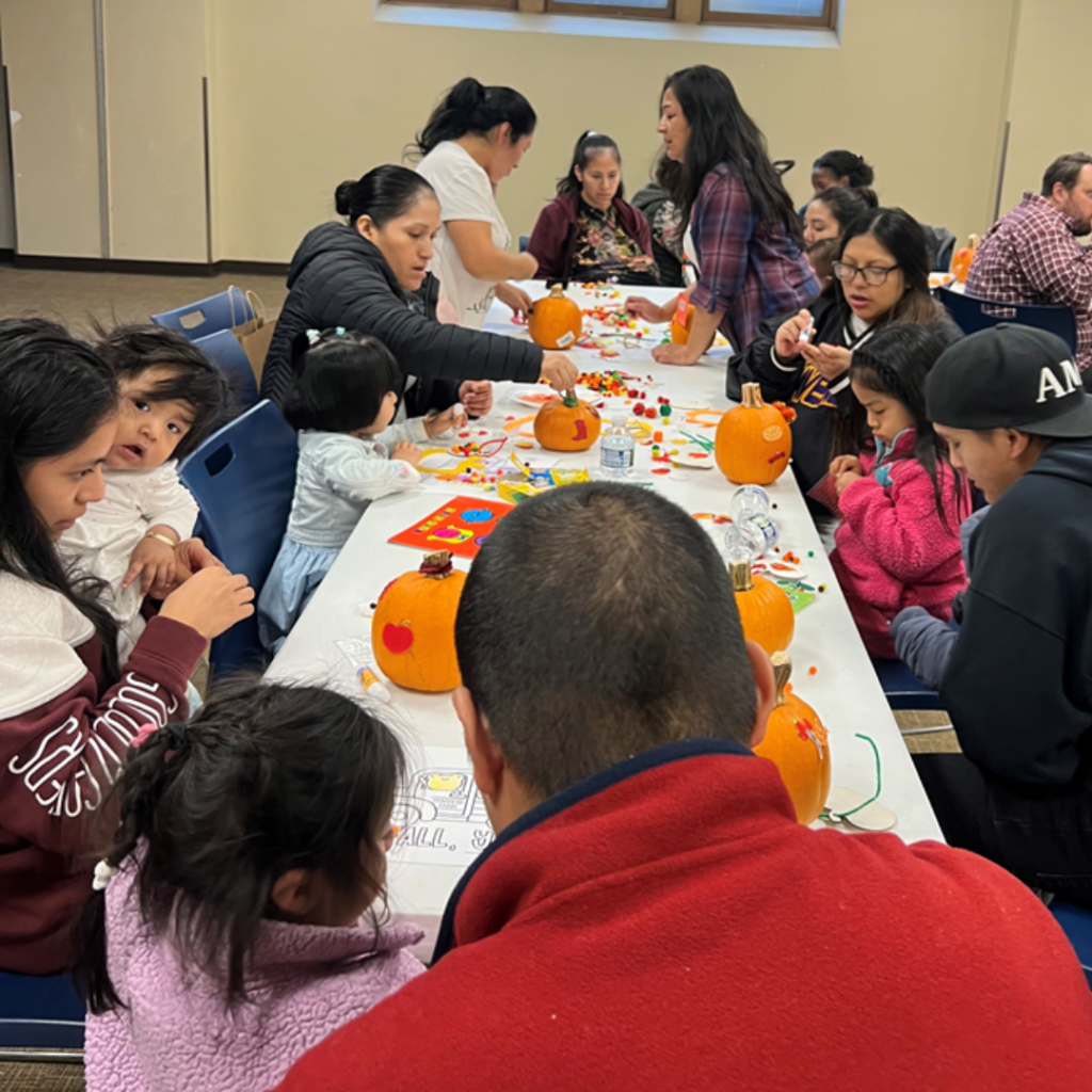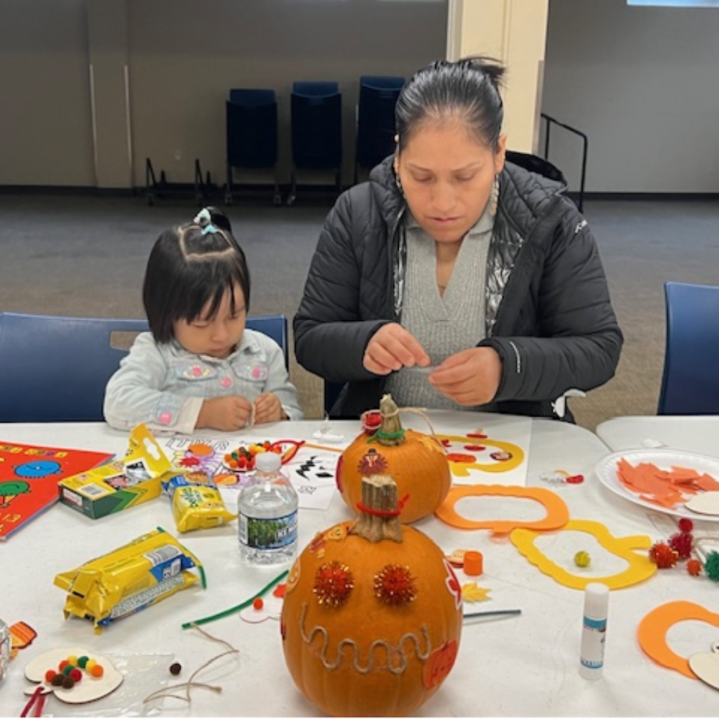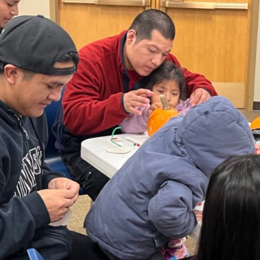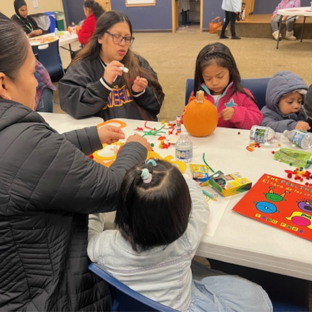 Parents split into English and Spanish-speaking groups to discuss practical discipline strategies using the Parents as Teachers curriculum. Meanwhile, children decorated pumpkins, practiced identifying shapes and colors, and listened to The Feelings Book/El libro de los sentimientos by Todd Parr—a bilingual story about understanding emotions.